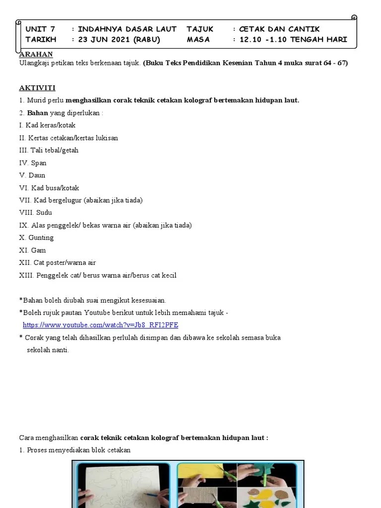 Berikut adalah proses penghasilan diorama hidupan laut: . Bahan yang digunakan ialah oil pastel kra. Bidang menggambar menggunakan teknik resis.teknik resis merupakan satu teknik penting dalam pembuatan batik. Resis adalah salah satu aktiviti dalam bidang menggambar. Alam semula jadi tajuk : Bahan yang digunakan ialah krayon atau lilin, warna poster, kertas lukisan, berus dan peralatan mewarna yang bersesuaian. Resis adalah salah satu aktiviti dalam bidang menggambar. Resis adalah teknik menolak warna pada media kalis air. 1 komponen satu aktiviti 1 : Standard pembelajaran 1.1 persepsi estetik murid dapat mengenal, memahami, .